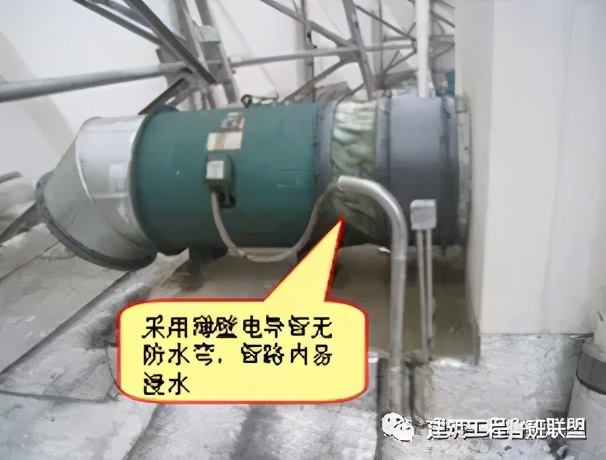 屋顶防排烟风机等设备采用电气保护管无防水弯头,或防水弯弯曲度小,雨水易沿软管外壁侵入保护管内,再加上软管接口脱落或密封不好,更易造成管路内进水。