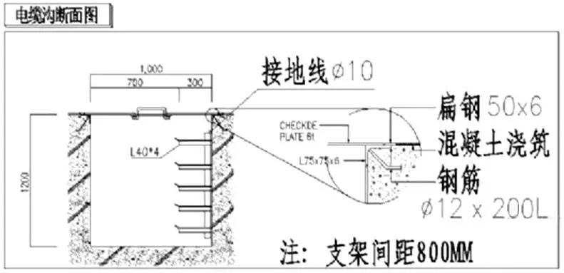 电缆沟内支架安装牢固间距均匀,接地可靠。