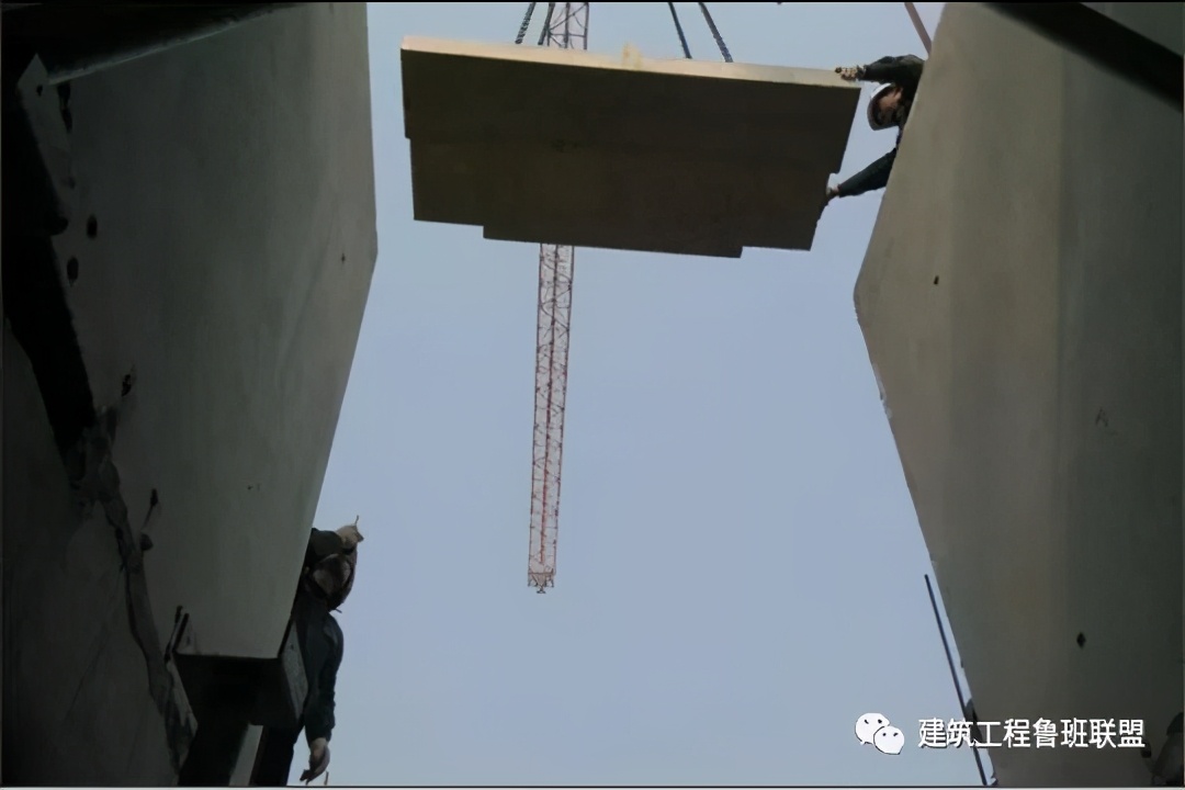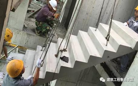 3、校正:基本就位后再用撬棍微调楼梯段,直到位置正确,搁置平实。安装楼梯板时,应特别注意标高正确,校正后再脱钩。
