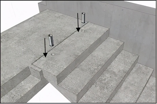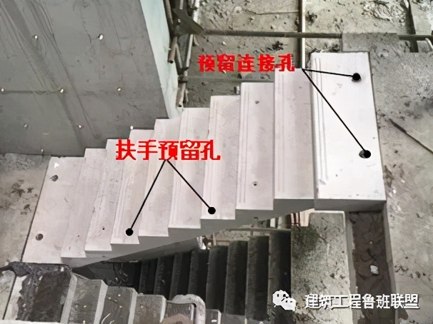 4、铰连接安装:楼梯段校正完毕后,用钢管将梯段上口预留孔与休息平台预留孔用进行连接,如下图所示。钢管外径略小于孔洞口径即可。