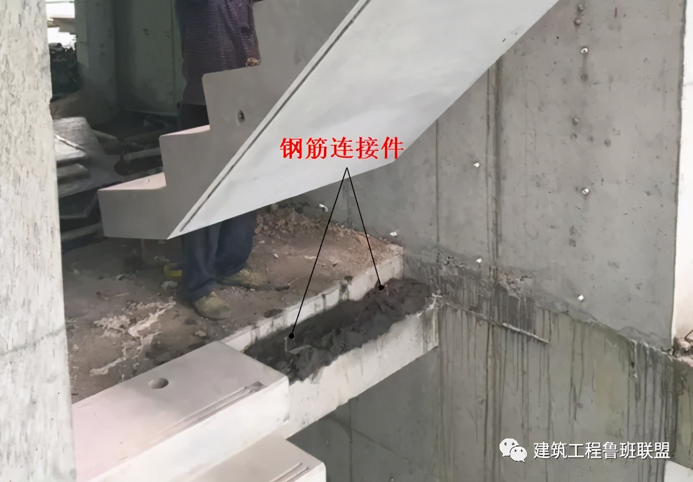每层楼板两块楼梯段安装后,经检查位置、标高无误后,即可将休息平台与梯段、梯段与周边墙板或柱子之间的空隙支模,浇筑细石混凝土。楼梯段与休息平台之间的缝隙用C20细石混凝土填灌严实,并养护,梯段和休息平台预留孔连接位置用灌浆料填灌严实。