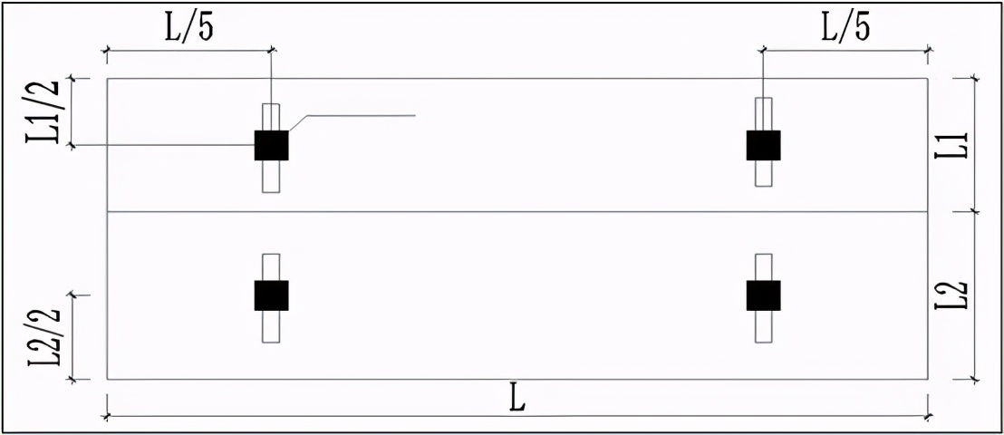 根据休息平台(梯梁)构件吊装位置,搭设支撑,支撑点位不少于四个,并在支撑上垂直休息平台长边方向放置木方,木方截面不小于5cm×5cm。根据休息平台高度控制线初步调整支撑高度。休息平台下方支撑点布置如下图所示。