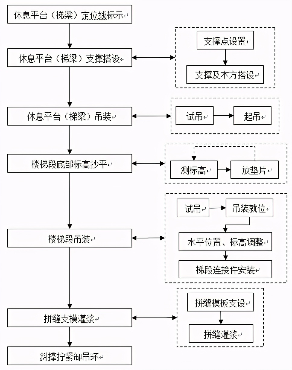 3、预制休息平台及楼梯段与周围机构之间拼缝之间注浆还未完成之前不得拆掉休息平台下面的临时支撑,防止休息平台的水平位置接标高发生偏移。