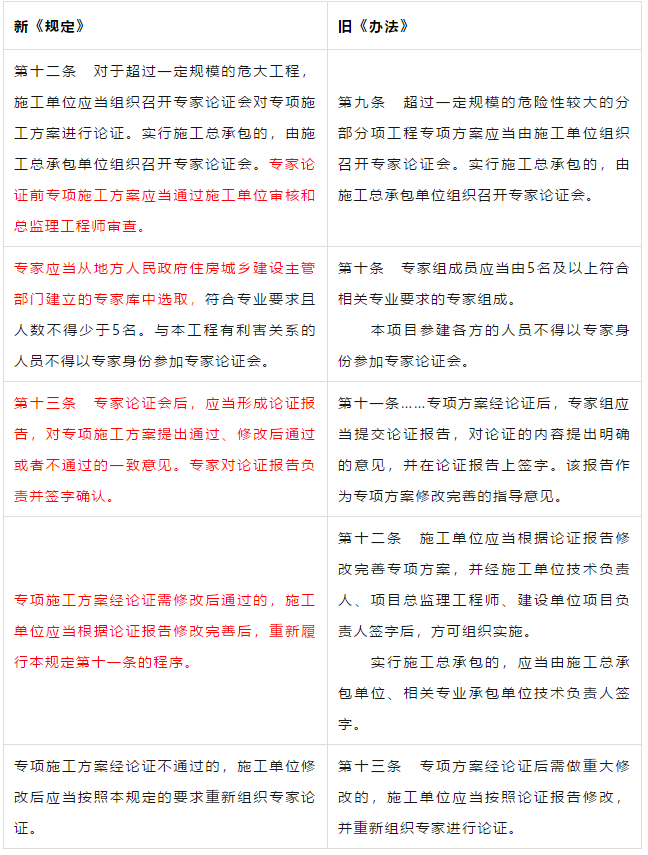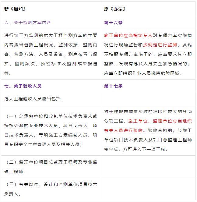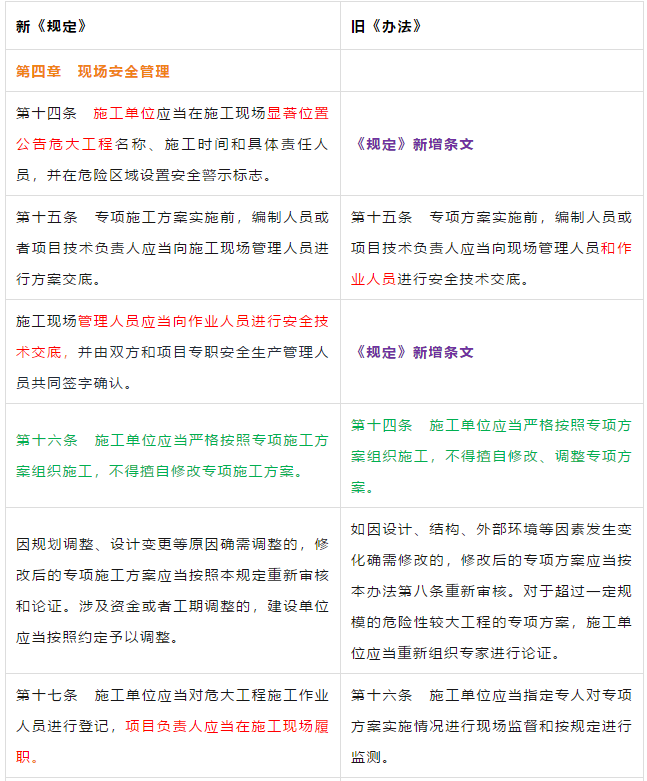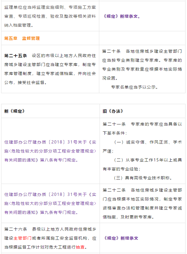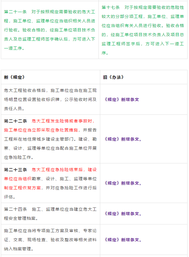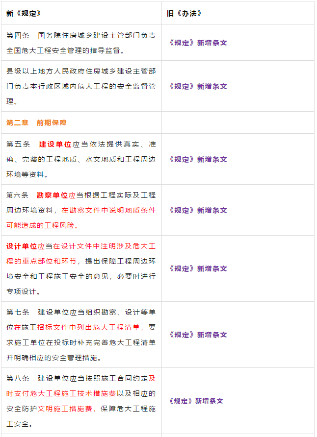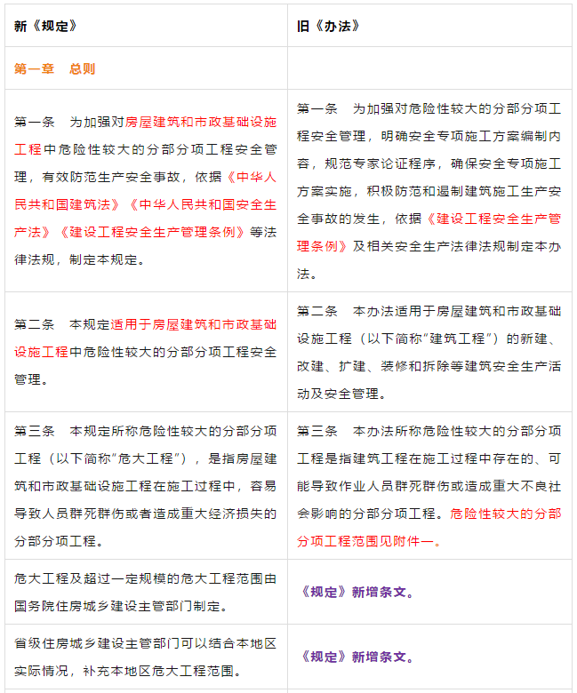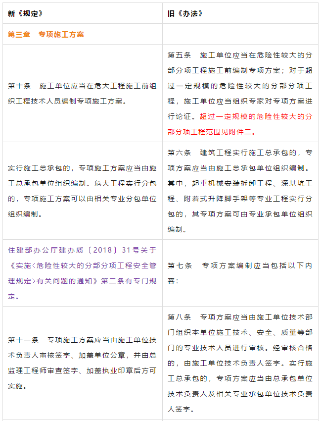 第二条 本条是对原《管理办法》条文的修订。 第三条 本条文第一款是对原《管理办法》条文的修订。 第二款为新增条款,危大工程及超过一定规模的危大工程范围由住建部门划分。建办质【2018】31号《关于实施<危险性较大的分部分项工程安全管理规定>有关问题的通知》对原建质[2009]87号《危险性较大的分部分项工程安全管理办法》中的附件一、附件二进行了重新修订公布。 第三款条文为新增条款。规定各地可根据当地的实际情况,开列本地的危大工程及超过一定规模的危大工程范围清单。 第四条 第五条 新增条文。规定了国家住建部门为监督指导部门,地方住建部门为本区域的监督管理部门。 第二章 前期保障 第八条 对危大工程所必需的费用专条列出。建设单位应按约定及时支付。以保障危大工程的监督实施。 第九条 是对原《管理办法》第四条的修订。 第三章 专项施工方案 第十条 第一款是对原《管理办法》第五条的修订。第二款是对原第六条的修订。 删除了原《管理办法》第七条的专项方案编制内容的要求。 第十一条 是对原《管理办法》第八条的修订。 在专项施工方案中施工单位相关技术负责人签字后,还须加盖公司公章。 危大工程虽然分包出去了,但总包单位和分包单位的技术负责人均需审核危大工程施工方案并签字加盖单位公章。实行双负责制。 强化监理责任。强调专项施工方案、危大方案都必需由总监理工程师审查签字、加盖执业印章后方可实施。 第十二条第一款是 对原《管理办法》第九条的修订。规定超过一定规模的危大工程专项施工方案,应当先通过施工单位审核和总监理工程师审查,再请专家论证。 第二款是 对原《管理办法》第十条的修订。 第十三条第一款是 对原《管理办法》第十一条的修订。第二款是 对原第十二条的修订。第三款是 对原第十三条的修订。 第四章 现场安全管理 第十五条 是对原《管理办法》第十五条的修订。将原由项目技术负责人应当向现场管理人员和作业人员进行安全技术交底,改为分级交底。 项目技术负责人向现场管理人员进行技术交底。 现场管理人员向作业人员进行安全技术交底。 第十六条 是对原《管理办法》第十四条的修订。明确如因方案调整,涉及资金或者工期调整的,建设单位应当按照约定予以调整。建设单位应保证危大方案实施的资金需求。 第十七条 是对原《管理办法》第十六条的修订。新增项目负责人应当在施工现场履职,项目专职安全生产管理人员应当对专项施工方案实施情况进行现场监督。强化了危大工程专人负责制度。 第十八、十九条 是对原《管理办法》第十八、十九条的修订。 第二十条 为新增条文。引入第三方监测单位,监测危大工程。 第二十一条 为新增条文。事故发生时施工单位是抢险工作第一责任人。 第二十二条 为新增条文。建设单位是事后恢复和评估的主要负责人。 第二十三条 为新增条文。规定施工单位和监理单位应建立危大工程安全管理档案及档案所需收集资料的内容。 第二十六条 为新增条文。规定当地安监部门应对危大工程进行抽查的要求。安监部门不能亲自检查的,可聘请有资质的社会机构代查。 第二十七条 为新增条文。 第二十八条 为新增条文。违规行为将记入企业或个人诚信档案 第六章 法律责任 本章内容是对原《管理办法》第二十三条的扩充,细化对在危大工程中各相关主体的责任。 原《管理办法》对危大工程事故发生后,只对建设单位、施工单位和监理单位进行相关处罚,如何处罚规定的比较模糊。 新《管理规定》对建设单位、勘察单位、设计单位、施工单位、监理单位、监测单位及政府住建主管部门等危大工程实施过程的参与方,均制定了详细的违规处罚措施,公开透明,可操作性强。对形成一个安全生产人人有责的良好氛围起到了促进作用。 为贯彻落实《危险性较大的分部分项工程安全管理规定》(住建部令第37号)2018年5月17日住建部办公厅发布 《关于实施〈危险性较大的分部分项工程安全管理规定〉有关问题的通知》。对《危险性较大的分部分项工程安全管理规定》的相关要求进行了细化规定。 《通知》取消了对专项施工方案关于应急预案编制的要求,专项施工方案编制必须按实际情况编制,并具有可实施,可操作性。认真按专项施工方案实施的危大工程,应该是安全的,可靠的。 所以《通知》没有强制性要求编制应急预案。 新《通知》将原《办法》中第三条:“安全施工的基本条件是否满足现场实际情况”,修改为:“专项施工方案是否满足现场实际情况,并能够确保施工安全“。 强调专项施工方案的重要性,危大工程必须按专项施工方案实施,专项施工方案要确保施工安全。 新《通知》对超过一定规模的危大工程专项施工方案经过专家论证后的修改流程进行了简化。 新《通知》对第三方监测机构的监测方案的内容作了具体规定。 新《通知》对危大工程验收人员组成做出明确规定:总包、分包单位、监理单位、勘察、设计、监测单位人员。 原《办法》规定比较模糊:施工单位、监理单位应当组织有关人员进行验收。 新《通知》对专家选取条件上进行了放宽。原《办法》规定的必须是:“从事专业工作”,现修改为:“从事相关专业工作”,有利于专家的选取。 新《通知》对