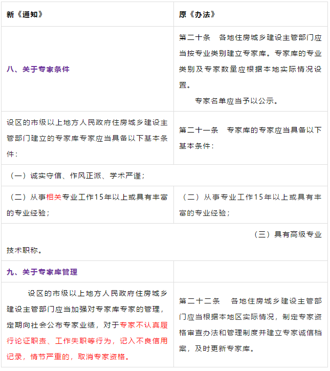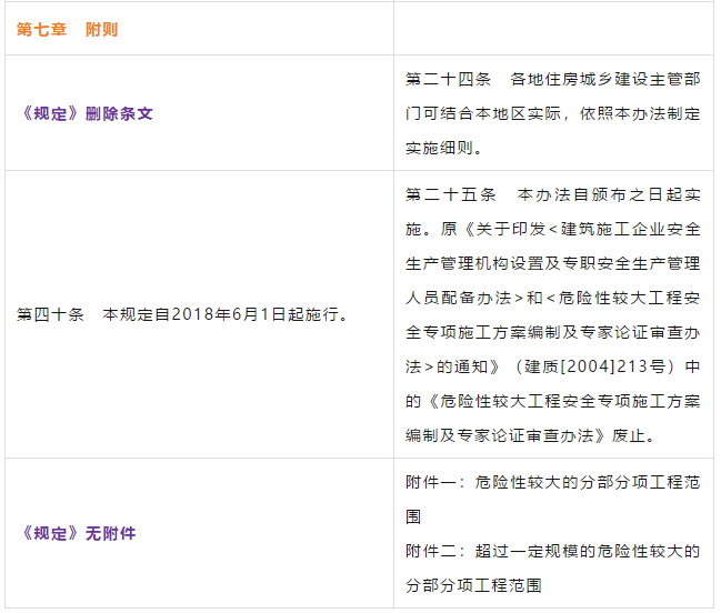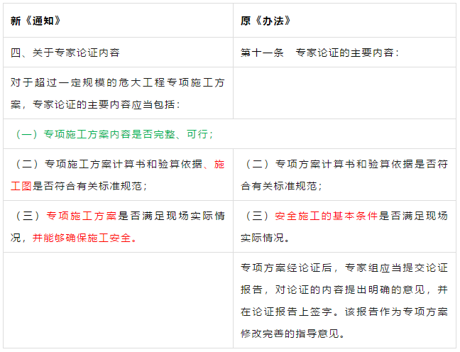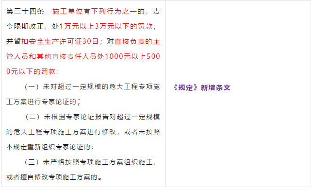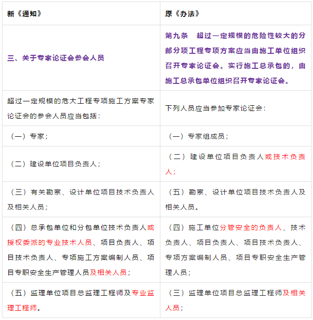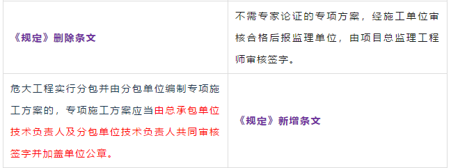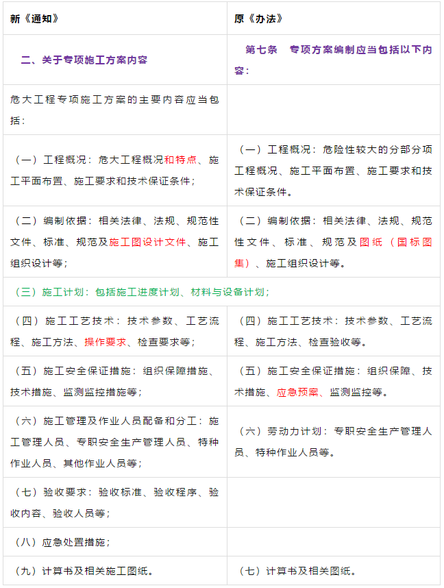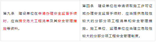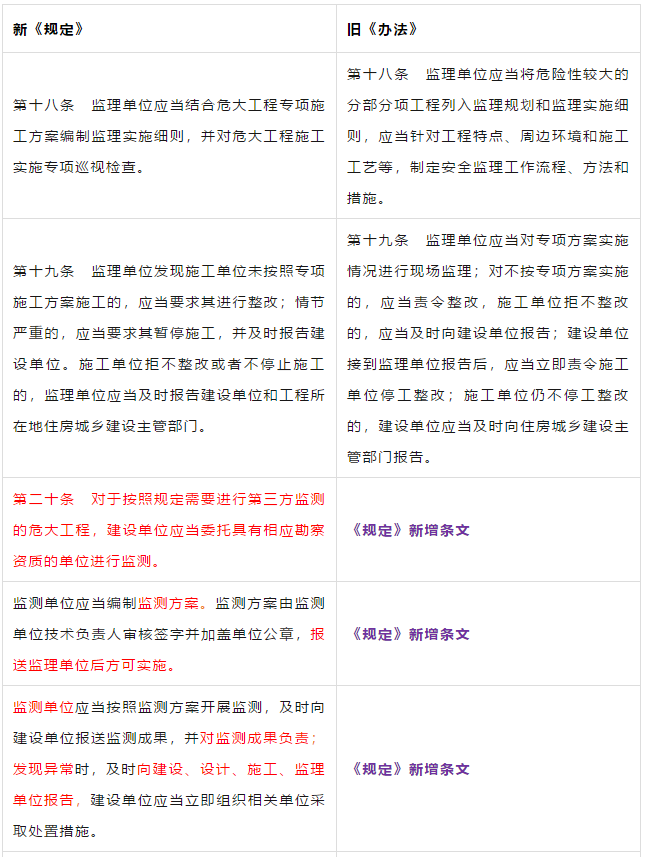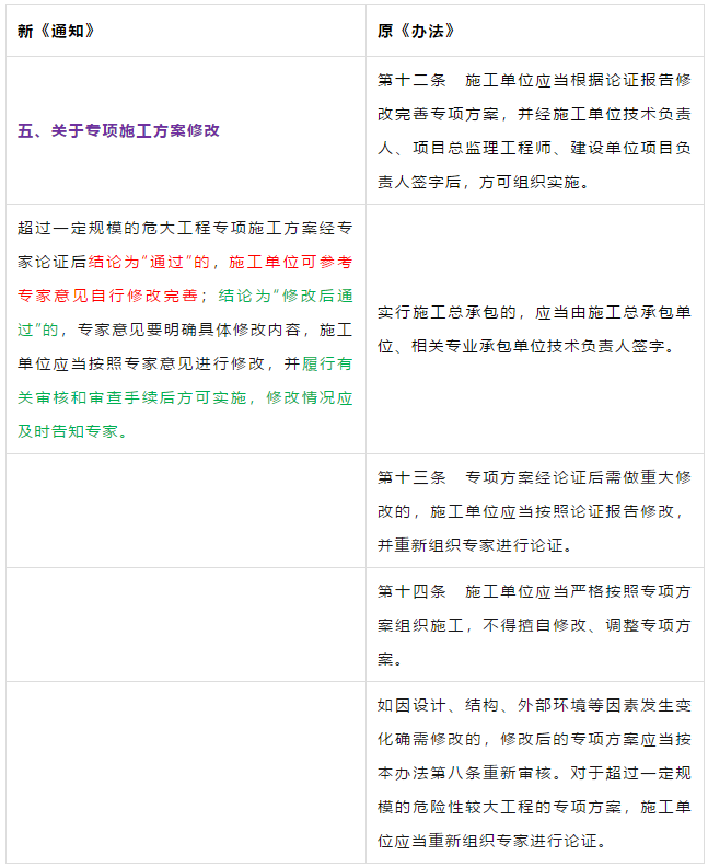 第二条 本条是对原《管理办法》条文的修订。 第三条 本条文第一款是对原《管理办法》条文的修订。 第二款为新增条款,危大工程及超过一定规模的危大工程范围由住建部门划分。建办质【2018】31号《关于实施<危险性较大的分部分项工程安全管理规定>有关问题的通知》对原建质[2009]87号《危险性较大的分部分项工程安全管理办法》中的附件一、附件二进行了重新修订公布。 第三款条文为新增条款。规定各地可根据当地的实际情况,开列本地的危大工程及超过一定规模的危大工程范围清单。 第四条 第五条 新增条文。规定了国家住建部门为监督指导部门,地方住建部门为本区域的监督管理部门。 第二章 前期保障 第八条 对危大工程所必需的费用专条列出。建设单位应按约定及时支付。以保障危大工程的监督实施。 第九条 是对原《管理办法》第四条的修订。 第三章 专项施工方案 第十条 第一款是对原《管理办法》第五条的修订。第二款是对原第六条的修订。 删除了原《管理办法》第七条的专项方案编制内容的要求。 第十一条 是对原《管理办法》第八条的修订。 在专项施工方案中施工单位相关技术负责人签字后,还须加盖公司公章。 危大工程虽然分包出去了,但总包单位和分包单位的技术负责人均需审核危大工程施工方案并签字加盖单位公章。实行双负责制。 强化监理责任。强调专项施工方案、危大方案都必需由总监理工程师审查签字、加盖执业印章后方可实施。 第十二条第一款是 对原《管理办法》第九条的修订。规定超过一定规模的危大工程专项施工方案,应当先通过施工单位审核和总监理工程师审查,再请专家论证。 第二款是 对原《管理办法》第十条的修订。 第十三条第一款是 对原《管理办法》第十一条的修订。第二款是 对原第十二条的修订。第三款是 对原第十三条的修订。 第四章 现场安全管理 第十五条 是对原《管理办法》第十五条的修订。将原由项目技术负责人应当向现场管理人员和作业人员进行安全技术交底,改为分级交底。 项目技术负责人向现场管理人员进行技术交底。 现场管理人员向作业人员进行安全技术交底。 第十六条 是对原《管理办法》第十四条的修订。明确如因方案调整,涉及资金或者工期调整的,建设单位应当按照约定予以调整。建设单位应保证危大方案实施的资金需求。 第十七条 是对原《管理办法》第十六条的修订。新增项目负责人应当在施工现场履职,项目专职安全生产管理人员应当对专项施工方案实施情况进行现场监督。强化了危大工程专人负责制度。 第十八、十九条 是对原《管理办法》第十八、十九条的修订。 第二十条 为新增条文。引入第三方监测单位,监测危大工程。 第二十一条 为新增条文。事故发生时施工单位是抢险工作第一责任人。 第二十二条 为新增条文。建设单位是事后恢复和评估的主要负责人。 第二十三条 为新增条文。规定施工单位和监理单位应建立危大工程安全管理档案及档案所需收集资料的内容。 第二十六条 为新增条文。规定当地安监部门应对危大工程进行抽查的要求。安监部门不能亲自检查的,可聘请有资质的社会机构代查。 第二十七条 为新增条文。 第二十八条 为新增条文。违规行为将记入企业或个人诚信档案 第六章 法律责任 本章内容是对原《管理办法》第二十三条的扩充,细化对在危大工程中各相关主体的责任。 原《管理办法》对危大工程事故发生后,只对建设单位、施工单位和监理单位进行相关处罚,如何处罚规定的比较模糊。 新《管理规定》对建设单位、勘察单位、设计单位、施工单位、监理单位、监测单位及政府住建主管部门等危大工程实施过程的参与方,均制定了详细的违规处罚措施,公开透明,可操作性强。对形成一个安全生产人人有责的良好氛围起到了促进作用。 为贯彻落实《危险性较大的分部分项工程安全管理规定》(住建部令第37号)2018年5月17日住建部办公厅发布 《关于实施〈危险性较大的分部分项工程安全管理规定〉有关问题的通知》。对《危险性较大的分部分项工程安全管理规定》的相关要求进行了细化规定。 《通知》取消了对专项施工方案关于应急预案编制的要求,专项施工方案编制必须按实际情况编制,并具有可实施,可操作性。认真按专项施工方案实施的危大工程,应该是安全的,可靠的。 所以《通知》没有强制性要求编制应急预案。 新《通知》将原《办法》中第三条:“安全施工的基本条件是否满足现场实际情况”,修改为:“专项施工方案是否满足现场实际情况,并能够确保施工安全“。 强调专项施工方案的重要性,危大工程必须按专项施工方案实施,专项施工方案要确保施工安全。 新《通知》对超过一定规模的危大工程专项施工方案经过专家论证后的修改流程进行了简化。 新《通知》对第三方监测机构的监测方案的内容作了具体规定。 新《通知》对危大工程验收人员组成做出明确规定:总包、分包单位、监理单位、勘察、设计、监测单位人员。 原《办法》规定比较模糊:施工单位、监理单位应当组织有关人员进行验收。 新《通知》对专家选取条件上进行了放宽。原《办法》规定的必须是:“从事专业工作”,现修改为:“从事相关专业工作”,有利于专家的选取。 新《通知》对