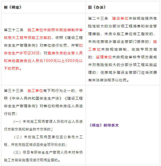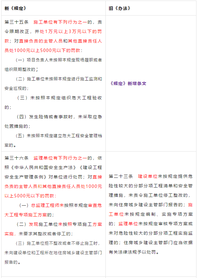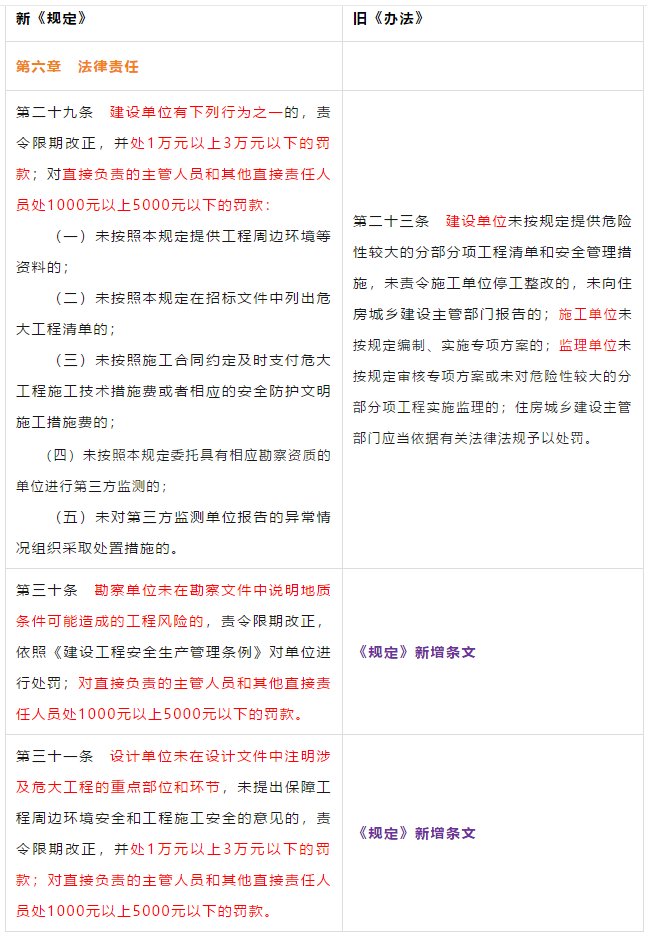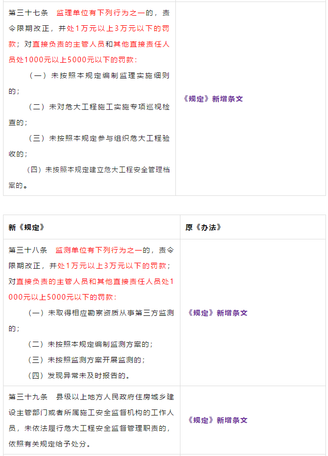 5、明确了各方主体的责任及处罚办法。对建设单位、勘察单位、设计单位、施工单位、监理单位、以及危大工程现场监测单位等责任划分更明确。