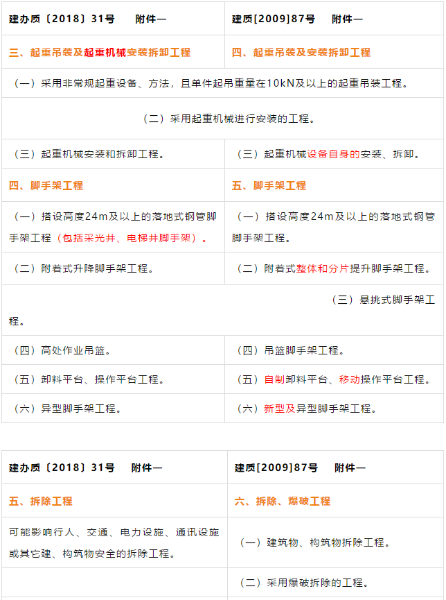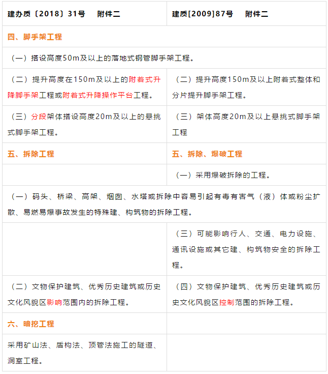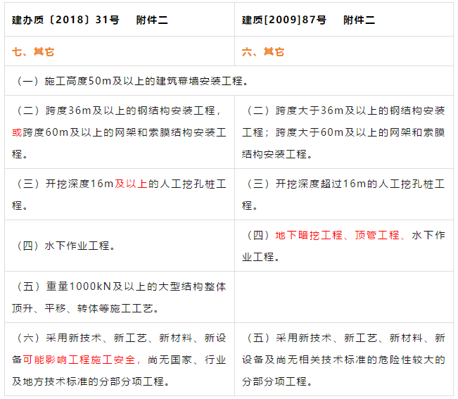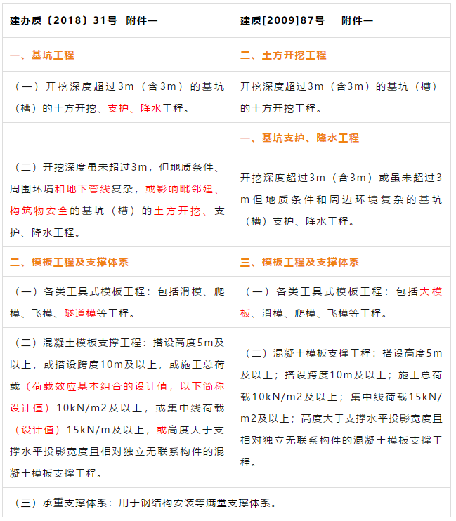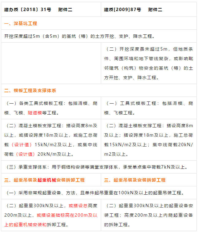 建办质【2018】31号文对原住建部建质【2009】87号《关于印发<危险性较大的分部分项工程安全管理办法>的通知》的附件一《危险性较大的分部分项工程范围》和附件二《超过一定规模的危险性较大的分部分项工程范围》进行了重新修订并重新发布。