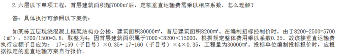 北京定额关于垂直运输,六层以下建筑的垂直运输费,在定额的答疑中有一个单独的规定就首层面积超过7000m2,需要乘相应系数,这部分往往被大家忽略,定额解释如下:
