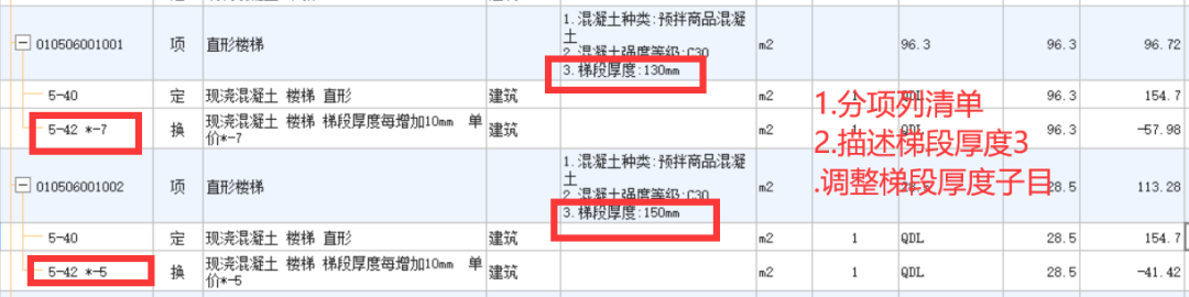 2.以北京定额为例,北京12预算定额5-40现浇混凝土楼梯 直行也是按m2计价,我们往往就把楼梯的全部投影面积放到这个清单和子目下就ok了,其实不知定额子目中的混凝土含量是按200mm厚的梯段编制的,梯段厚度不同需要调整厚度,所以在我们编清单计价的时候就需要将不同厚度的梯段区分出来。