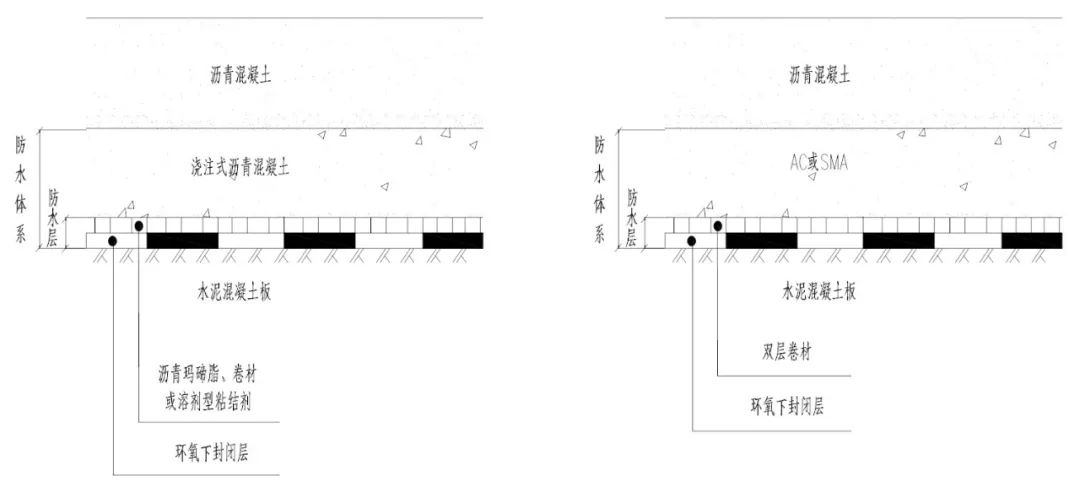 1、特大桥、重要大桥宜选择浇注式沥青混凝土、或沥青玛蹄脂、或涂膜等防水层,下面层宜用浇注式沥青混凝土、沥青玛蹄脂碎石(SMA)组成防水体系。