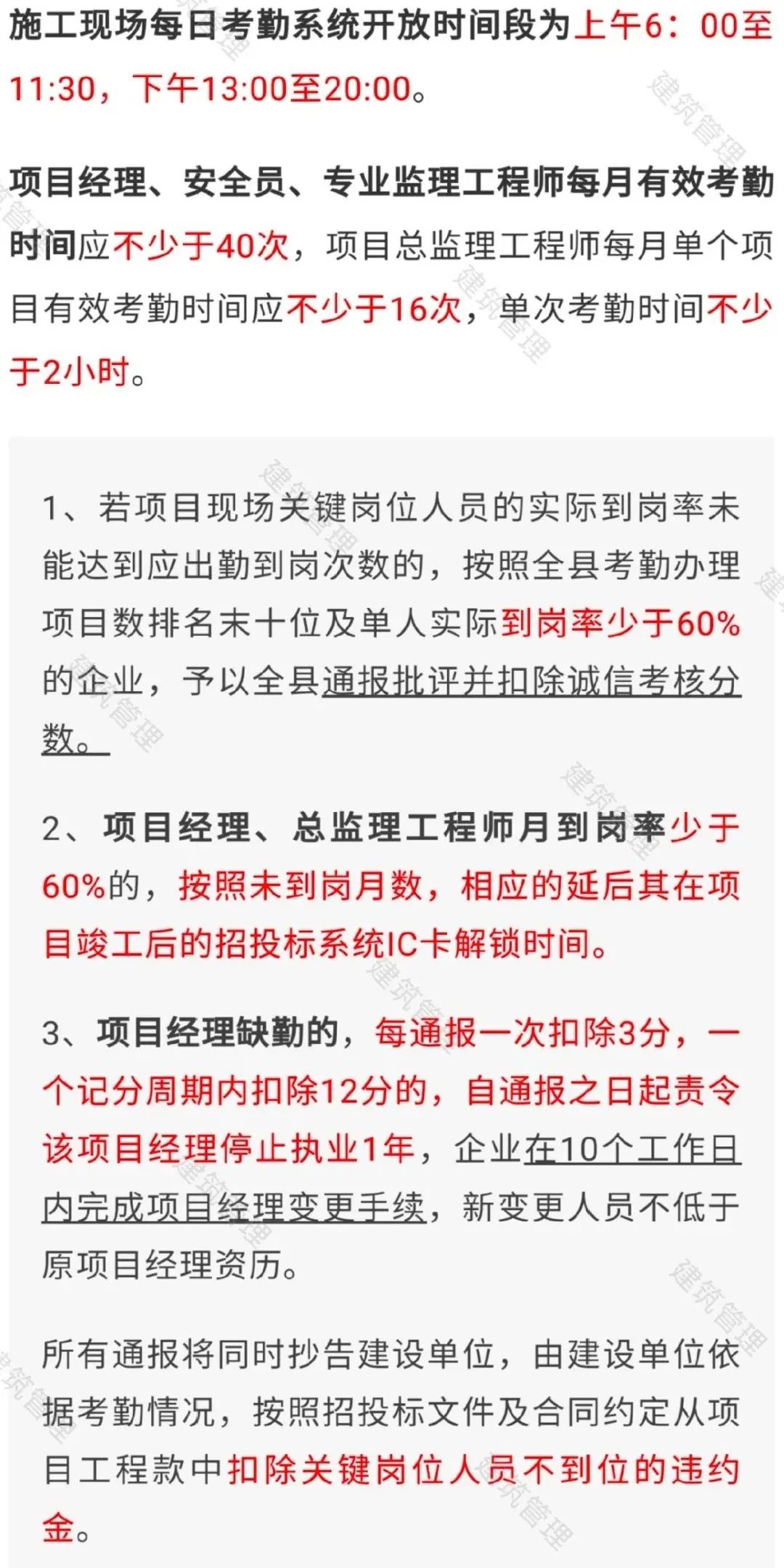 项目经理、总监未到岗,一律停工切断用电!够狠!项目经理、总监需每日两次人脸考勤,4小时以内无效!项目经理等须每天人脸识别考勤!全部实名登记!项目经理到岗率小于60%,按照未到岗月数,延后其招投标系统IC卡解锁时间