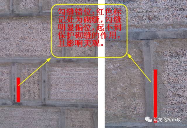 3.2 勾缝前,先清理缝槽,用水冲洗湿润,再涂抹砂浆。勾缝应整齐、拐角圆滑、宽度一致、不出毛刺,不得空鼓、脱落,不得有偏缝。水平缝与竖直缝应深浅一致、密实光滑,搭接处平整,不能有丢缝、瞎缝现象。