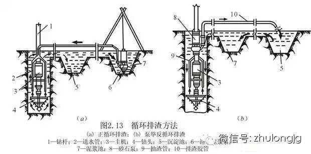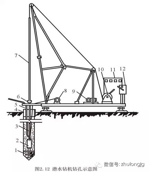 潜水钻机成孔。潜水钻机是一种旋转式钻孔机,其防水电机变速机构和钻头密封在一起,由桩架及钻杆定位后可潜入水、泥浆中钻孔。注入泥浆后通过正循环或反循环排渣法将孔内切削土粒、石渣排至孔外。