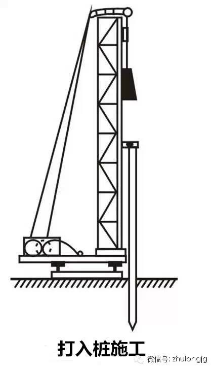 预制桩是在工厂或施工现场制成的各种形式的桩,用沉桩设备将桩打入、压入或振入土中,或有的用高压水冲沉入土中。根据沉入土中的方法,可分打入桩(锤击沉桩)、水冲沉桩、振动沉桩和静力压桩等;