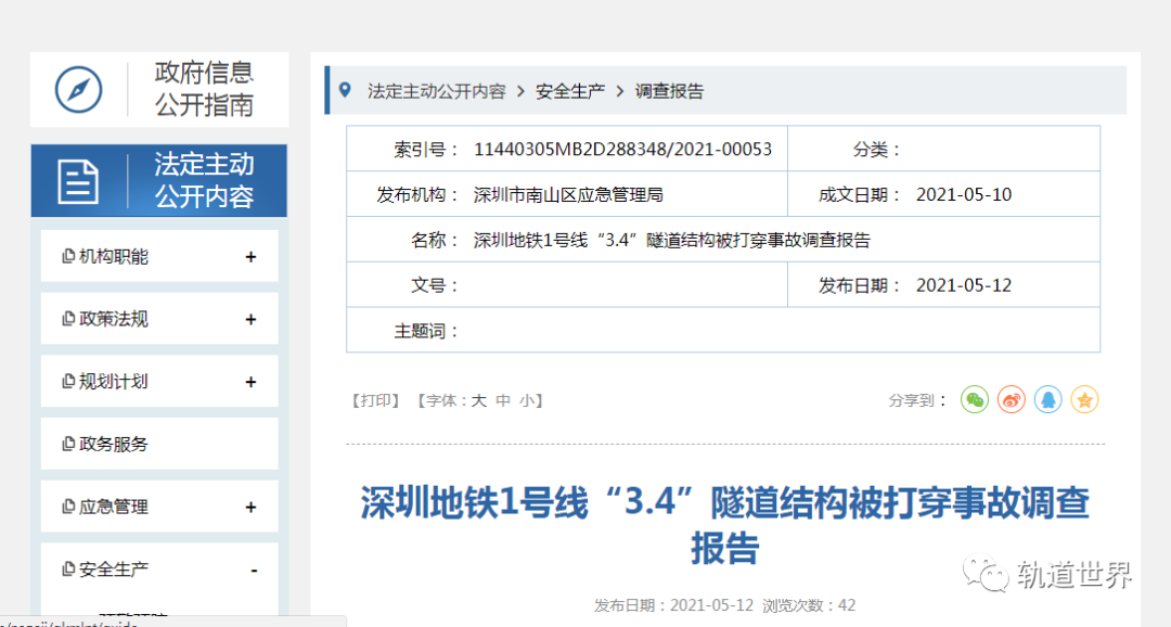 日前,《深圳地铁1号线“3.4”隧道结构被打穿事故调查报告》已经区政府批复,现予公布。