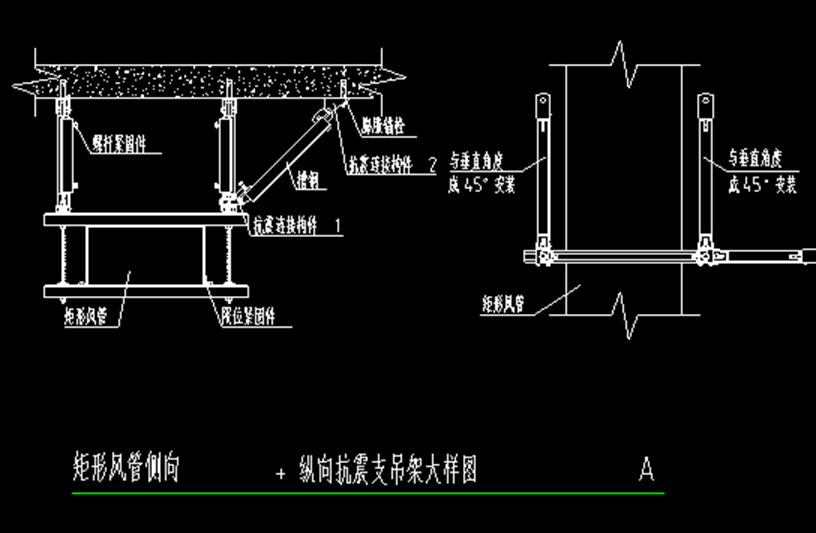 单管抗震支架安装示意图:DN65以上的给水、热水、消防管道(含消火栓、气体灭火、喷淋等)系统。当管道中安装的附件质量大于25kg时,也应设置侧向及纵向抗震支架。