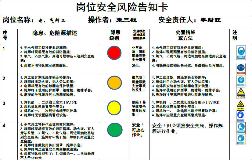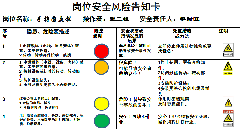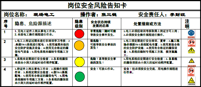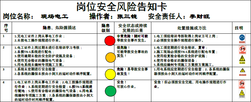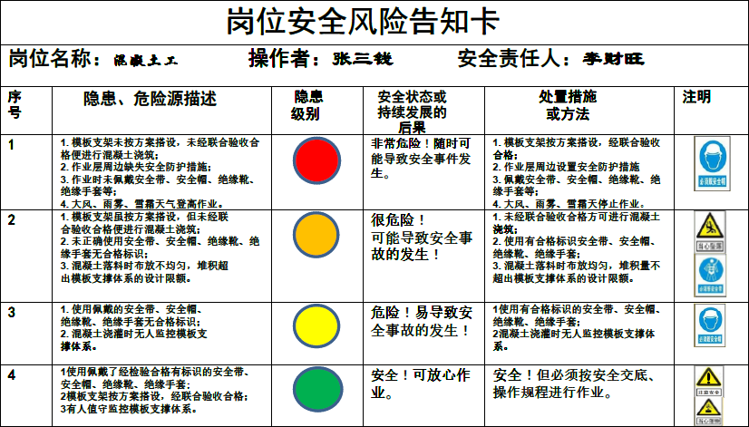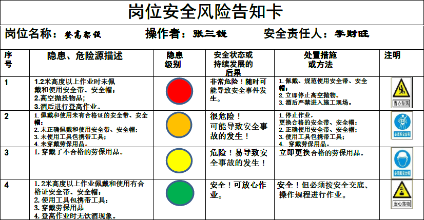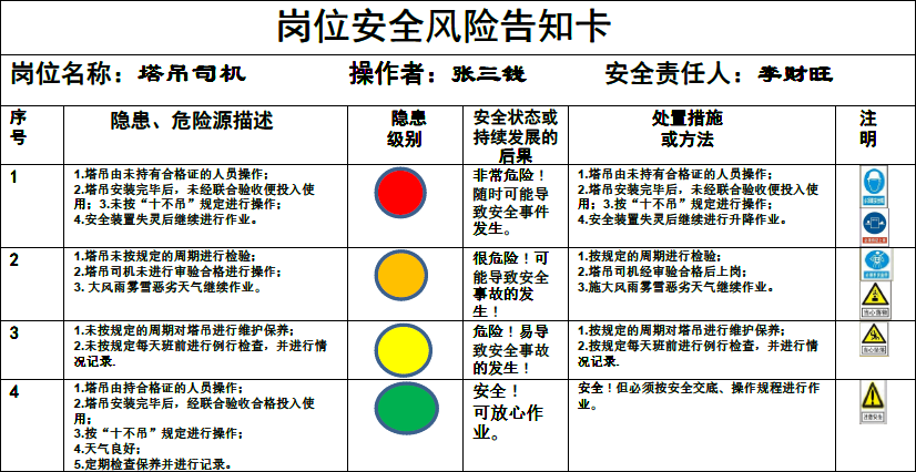 我参考“双体系建设”的风险分级管控和安全事故隐患排查治理的一些做法,总结以往工程出现的隐患情况,采取“预见法”将安全隐患按其危险程度不同分为“红、黄、橙、绿”四色,分别对应“一、二、三、四”级不同程度危险,按其发展程度提出不同的处置措施或方法;由此,我推荐将这些按卡片的形式,全部写到卡片里按不同的岗位人员在进入施工现场时各执一卡随身携带,让工人在未投入作业前首先了解本岗位易出现的安全隐患在哪里,何种状态下有多大的风险,何种状态下应如何处理。这样便于上岗作业时对照查实执行,暂且把这卡片叫做《岗位安全风险告知卡》。
