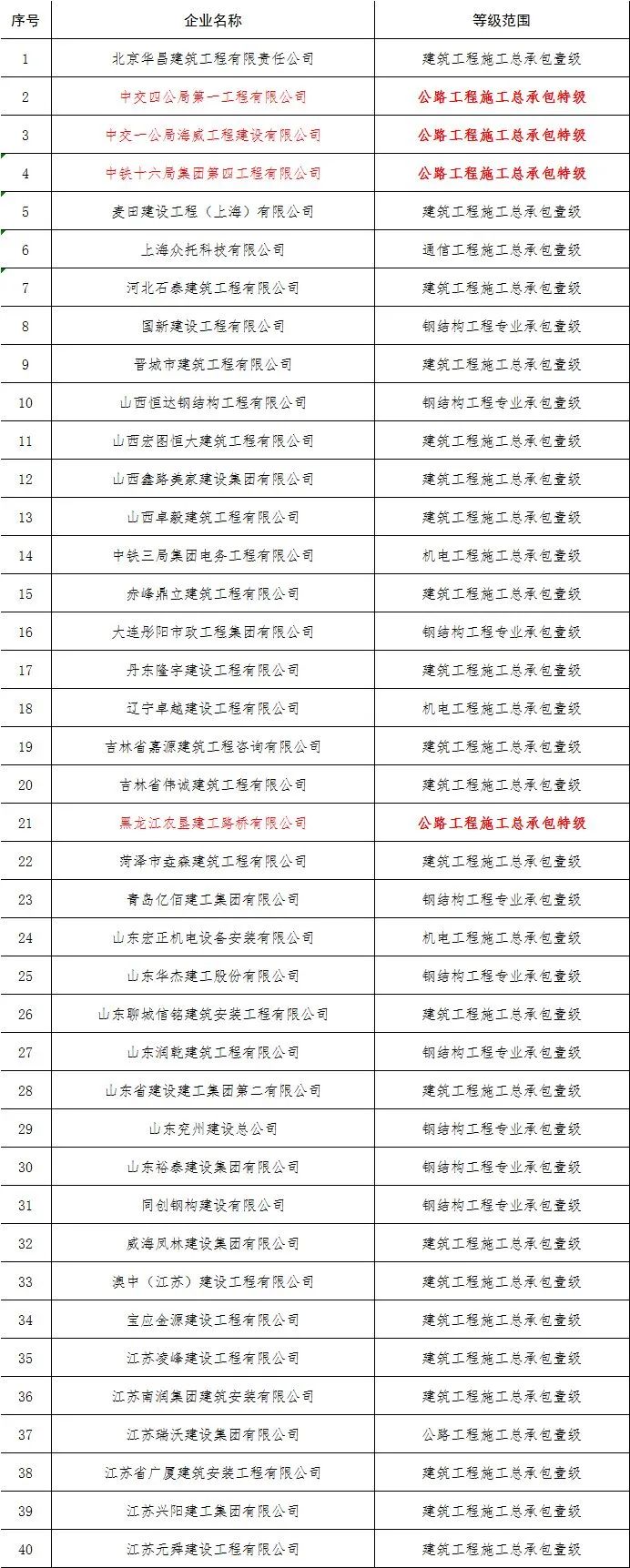 近日,住建部公布了2021年度第三批建设工程企业资质核准名单,此次共有138家企业拿到139项建筑业企业资质,十六家建企升特成功。