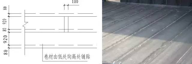 铺贴从流水坡度的下坡开始,先远后近的顺序进行,使卷材长度与流水坡度垂直,搭接顺流水方向;上下层卷材不得相互垂直铺贴,第二层铺贴的卷材必须与第一层错开1/2宽度。