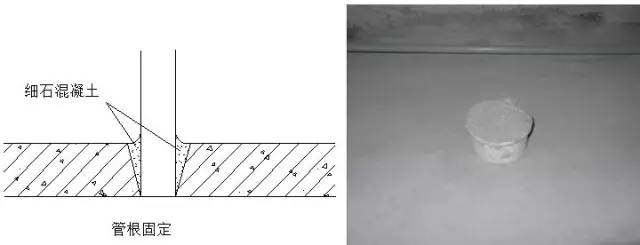 穿过屋面和墙面的管根部位,应用内掺3%膨胀剂的细石混凝土填塞密实,将管根固定。