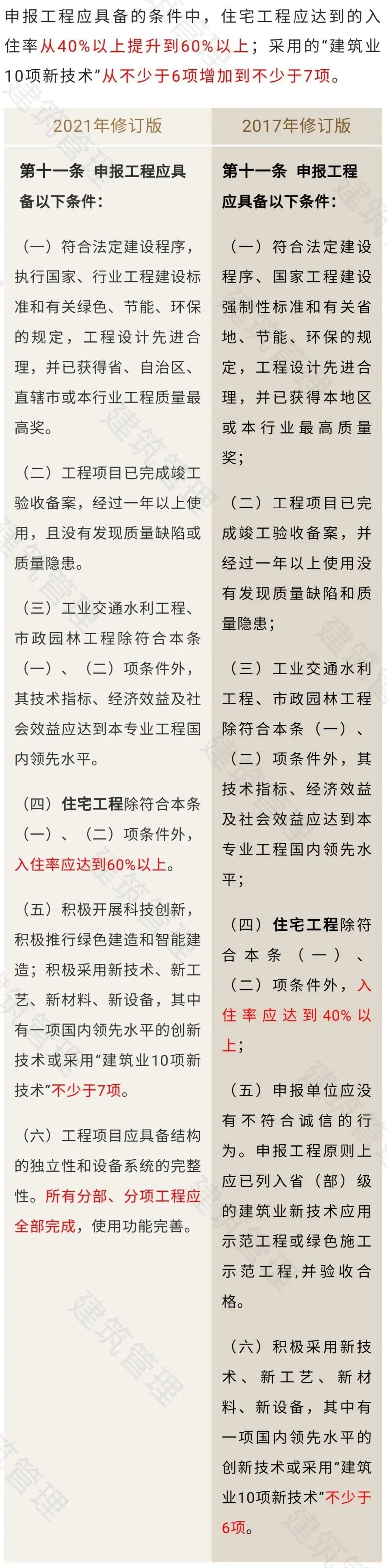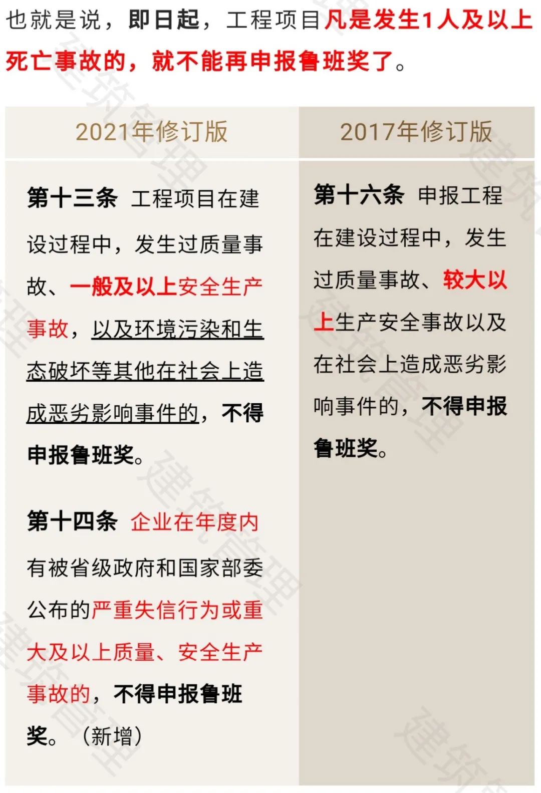 在申报条件中,由此前“发生过质量事故、较大以上安全生产事故...不得申报鲁班奖。”改为“发生过质量事故、一般及以上安全生产事故...不得申报鲁班奖。"且在年度内被列为严重失信的,也将不得申报。