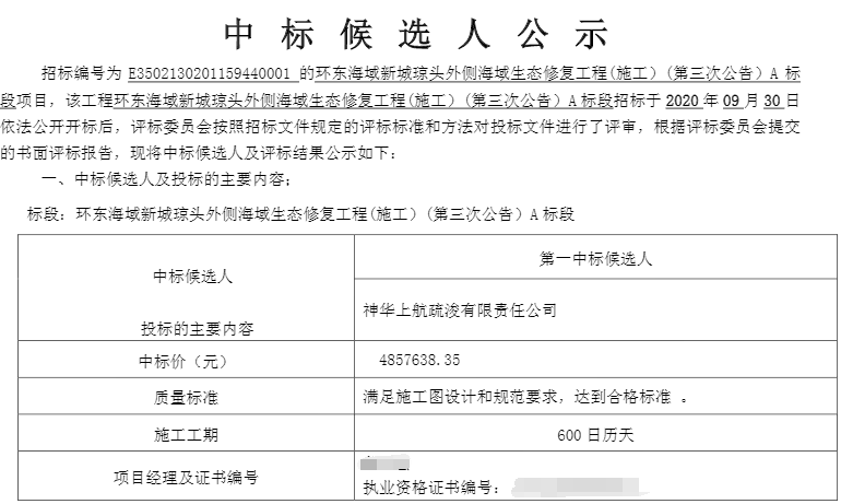 2020年10月公示的环东海域新城琼头外侧海域生态修复工程(施工)(第三次公告)施工招标,其A标段招标控制价为48332万元,而中标单位的中标价仅为485万元。