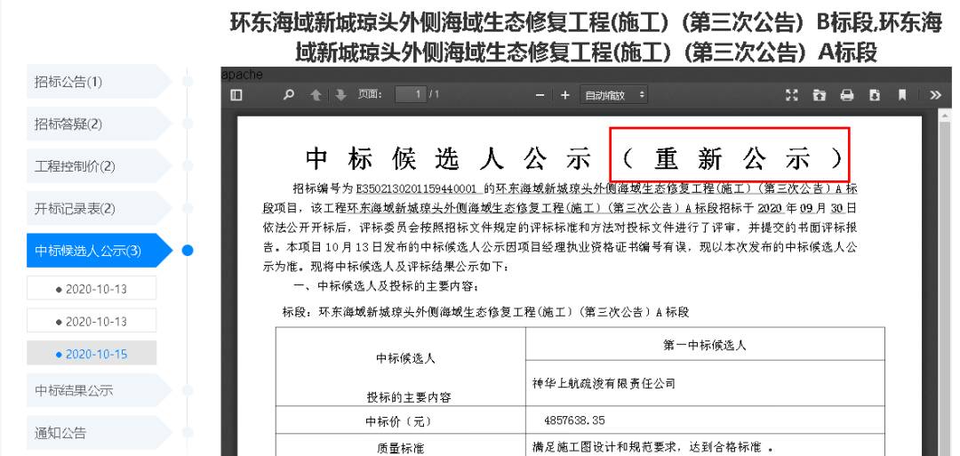 2020年10月公示的环东海域新城琼头外侧海域生态修复工程(施工)(第三次公告)施工招标:- 其A标段招标控制价为48332万元,而中标单位的中标价仅为485万元;