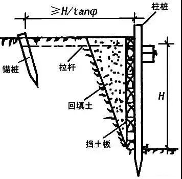 先沿基坑边缘打设柱桩,在柱桩内侧支设挡土板,柱桩上端用拉杆拉紧,挡土板内侧填土夯实。适用于深度不大、不能安设横(斜)撑的大型基坑使用。