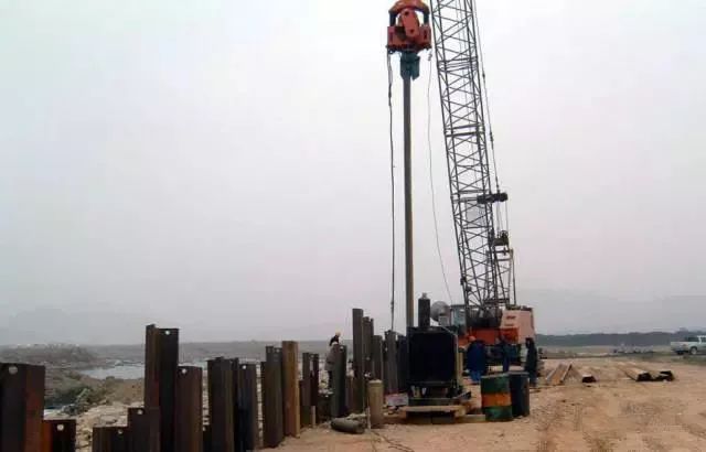 先沿板桩边线搭设双层围檩支架,然后将板桩依次在双层围檩中全部插好,形成一个高大的板桩墙。待四角封闭合拢后,再按阶梯形逐渐将板桩一块块打至设计标高。该打法可保证平面尺寸准确和板桩垂直度,但施工速度慢。