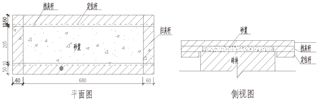 根据砌筑墙体厚度制作定型化快速布灰器,定位杆间距大于墙体厚度5mm,挡灰杆小于墙体厚度15mm;