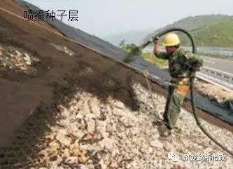 4)液压喷播种子层:将混合种子、粘合剂、肥料、保水剂、木纤维和水等按一定比例配制成的粘性浆体,通过高压,直接喷送至边坡上。喷下的种子泥浆应当具有良好的附着力及明显的颜色,不遗漏、不重复且均匀。