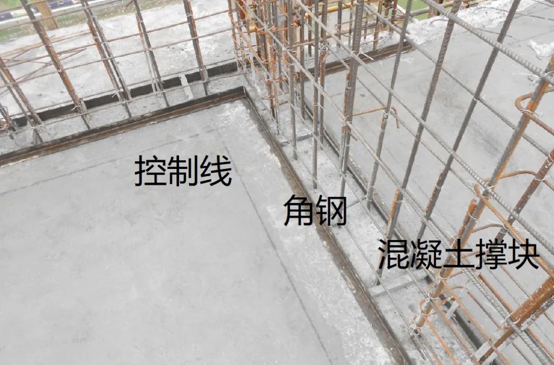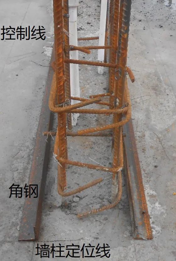 为解决墙柱根部漏浆问题,当前的工程项目普遍采用角钢体系,有效杜绝了根部漏浆、烂根和变形移位现象等质量通病:采用钢钉固定角钢,使之成为一个整体,既能保证墙、柱混凝土振捣时不外漏浆体,无烂根变形,又能确保墙柱支模定位无偏移现象;另外,如与角铁接触的混凝土楼面上口增设一条橡塑保温薄板,效果更佳。