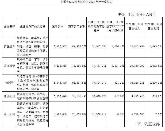中国中车股份有限公司2021上半年主要财务指标情况: