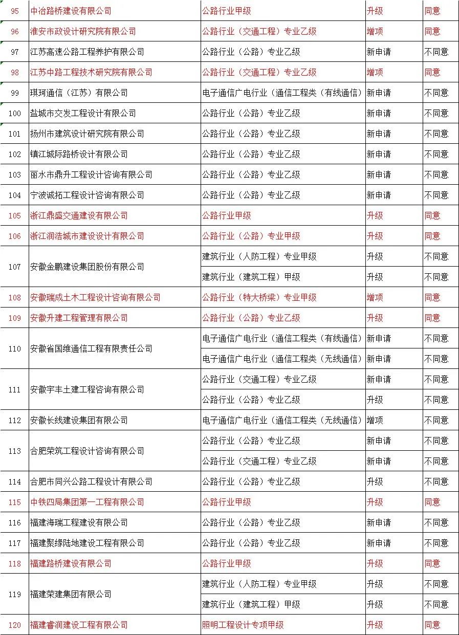 | 99 | 福建路桥建设有限公司 | 公路工程施工总承包特级 | 升级 | 同意 |