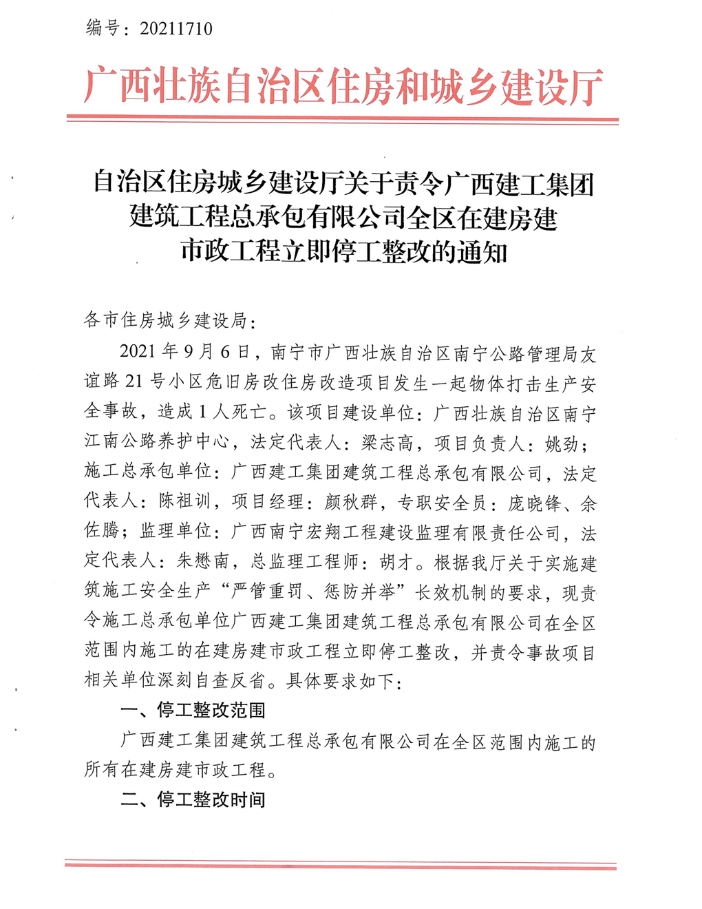 附件:自治区住房城乡建设厅关于责令广西某某集团建筑工程总承包有限公司在建房建市政工程立即停工整改的通知(编号:20211710)