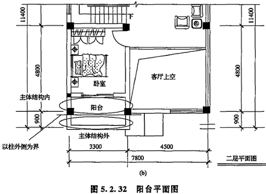 21、在主体结构内的阳台,应按其结构外围水平面积计算全面积;在主体结构外的阳台,应按其结构底板水平投影面积计算1/2面积。