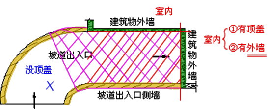 6、出入口外墙外侧坡道有顶盖的部位,应按其外墙结构外围水平面积的1/2计算面积。