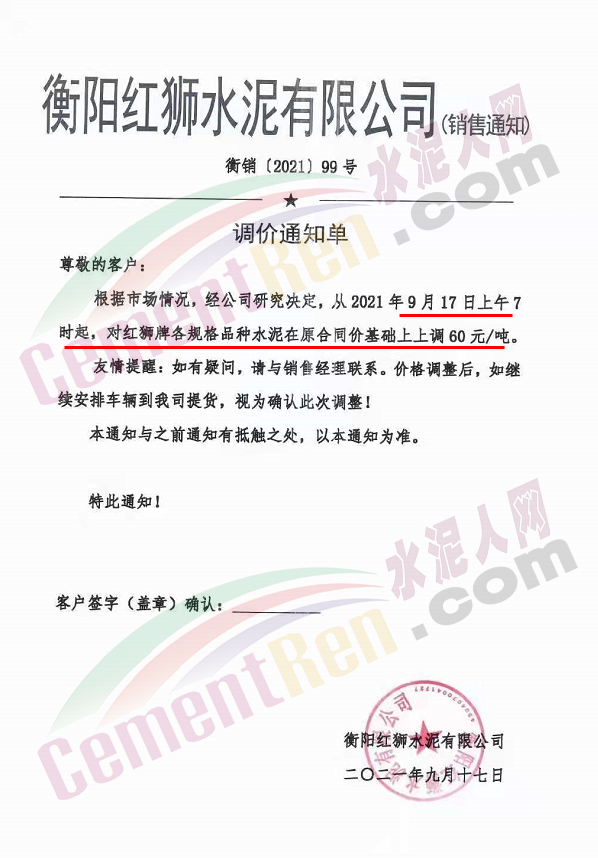 衡阳红狮水泥通知,自9月17日上午7时起上调各规格品种水泥价格60元/吨。