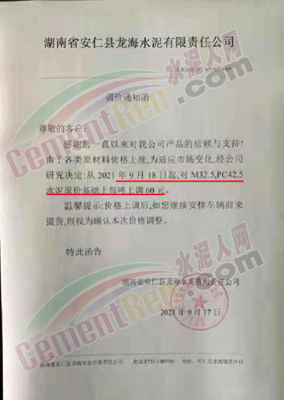 湖南省安仁县龙海水泥有限责任公司通知,自9月18日起,上调水泥价格60元/吨。