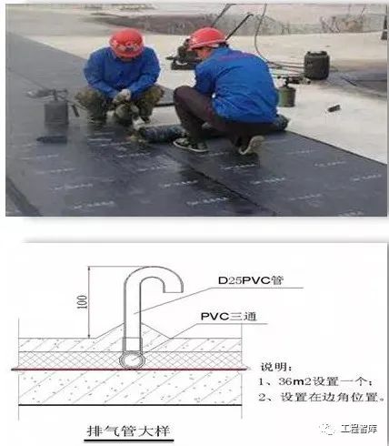 潮湿基层上铺设卷材,在防水层内留排气孔通风。