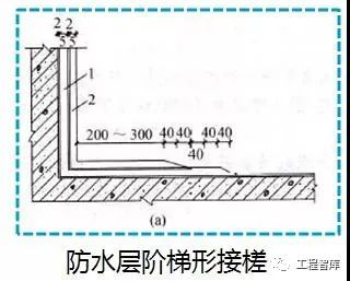 防水层的施工缝需留斜坡阶梯形槎,接槎要依照层次顺序分层进行,留槎离阴角不小于200mm,