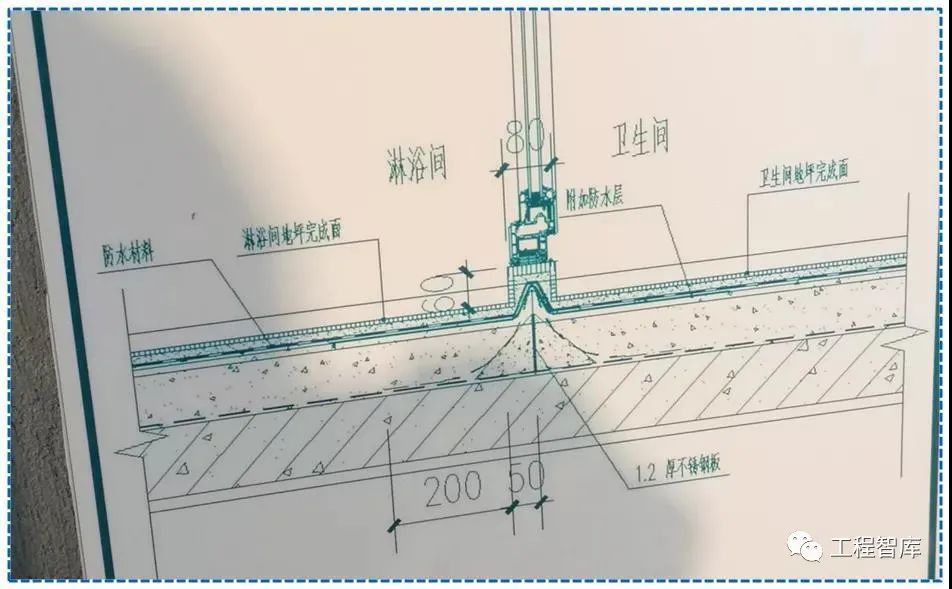 淋浴房挡水采用L型不锈钢板,用细石混凝土固定,涂刷防水涂料并完全覆盖挡板。