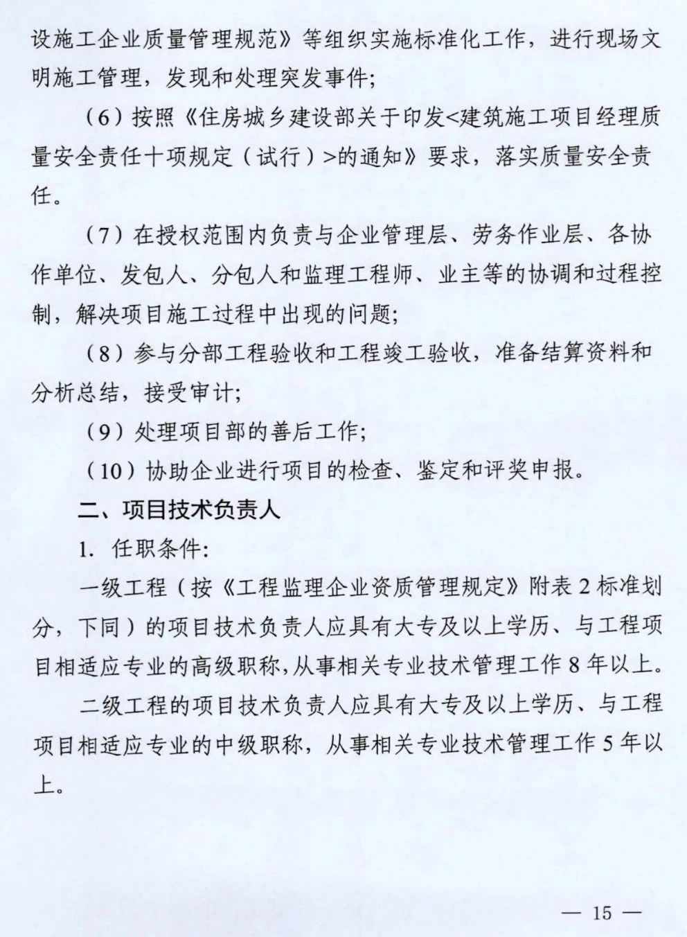 第三条 建筑工程施工项目部、现场监理部关键岗位人员数量不得低于本办法规定(施工项目部关键岗位人员配备标准见附件1、现场监理部关键岗位人员配备标准见附件2),且必须按规定认真履行岗位职责(施工项目部关键岗位人员任职条件和职责详见附件3,现场监理部关键岗位人员任职条件和职责详见附件4)。施工企业应根据工程需要配备其他相应的管理人员。