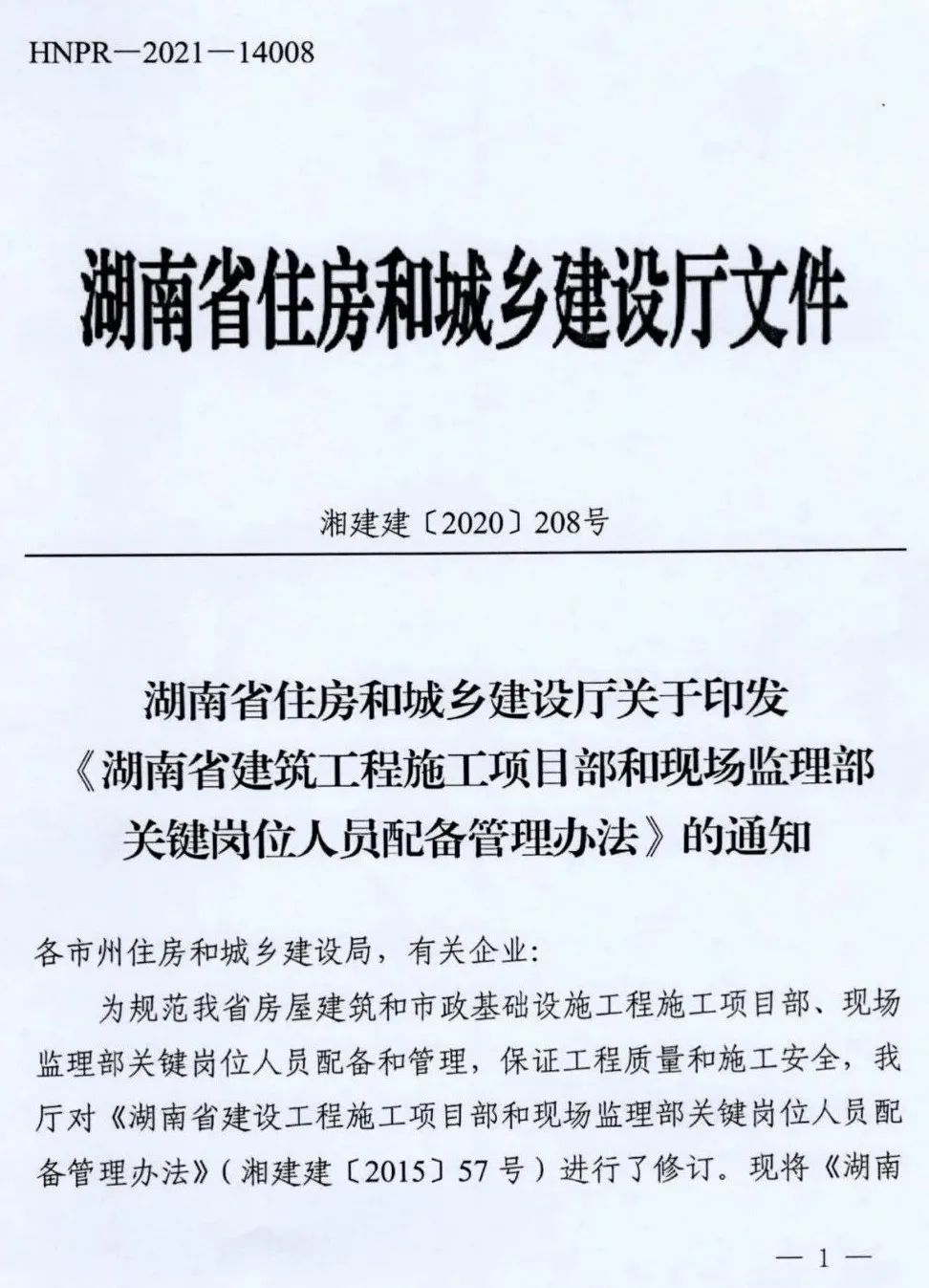 湖南省住建厅发布《湖南省建筑工程施工项目部和现场监理部关键岗位人员配备管理办法》,自2021年3月15日起实施。