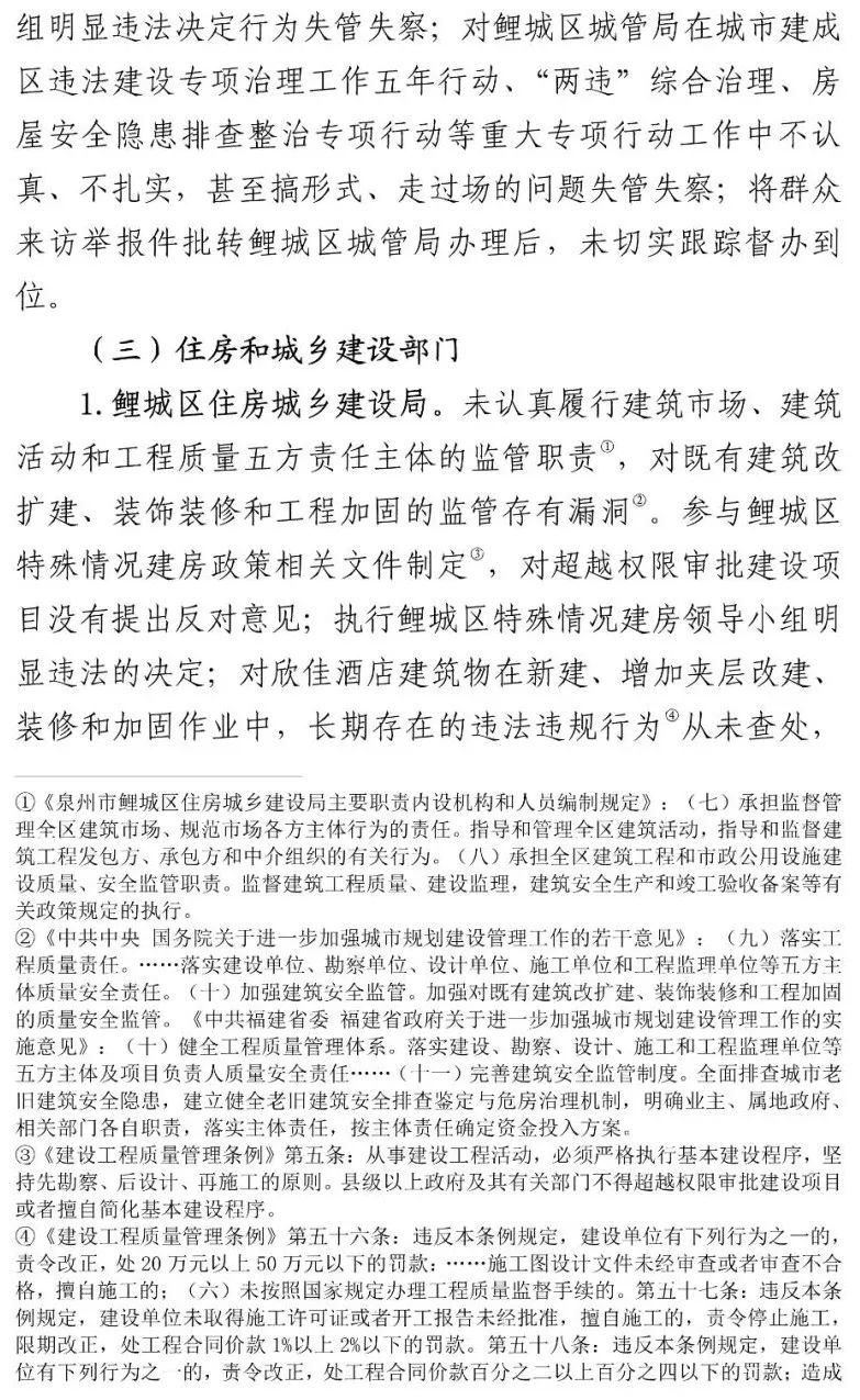 泉州市各级住建部门对建筑活动和工程质量负有监管主体责任,但对于欣佳酒店建筑的长期违法违规行为从未发现和查处。