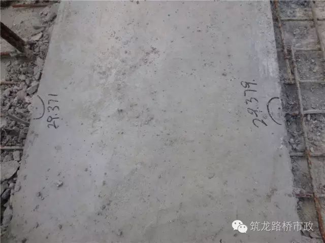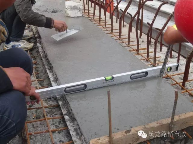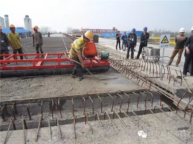 设立振捣梁轨道方式进行桥面铺装施工可做到无纵向施工缝,设置标高带方式进行桥面铺装施工单幅存在两条纵向施工缝。我部采用浇筑铺装混凝土前对此处进行再次洒水湿润,混凝土浇筑后采用细抹刀对纵向施工缝位置仔细进行二次修饰抹平。经采用标高带方式进行的首件铺装工程两条纵向接缝不明显,对铺装及其外观整体性产生的影响极小。