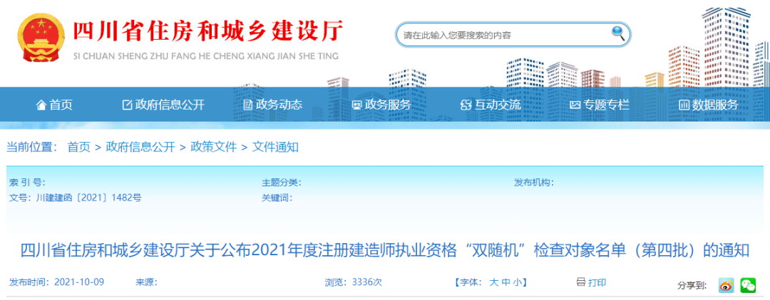 ▶ 8月26日,四川省住建厅发布《关于2021年度注册建造师执业资格“双随机”检查(第三批)结果的通告》。