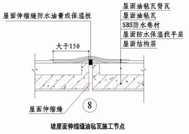 13)坡屋面伸缩缝铺油毡瓦时,基层找平时向缝两边高出屋面30mm斜面翻边,用防水油膏或保温板封堵伸缩缝后,粘贴SBS防水卷材,伸缩缝处铺油毡瓦脊瓦(见图8) 。