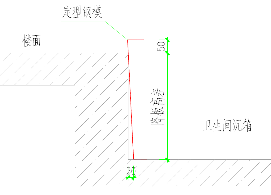 1)标高定位:根据卫生间吊模底边标高,利用卫生间四周梁箍筋焊接Φ12水平钢筋(每边至少2个,要求水平钢筋超出梁边控制线至少50mm)作为定型钢模底支撑。注意点焊施工时不得烧伤主筋或箍筋。标高定位筋施工完成即可吊装定型钢模,进行平面定位复核。