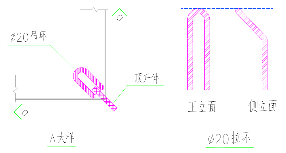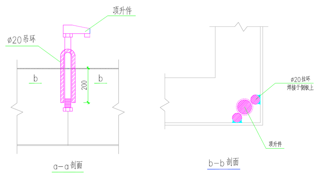 2)定型钢模四个角部设Φ20拉环穿过上翼板焊接于钢模内壁,同时利用拉环固定支腿设置顶升件。做法如下图。
